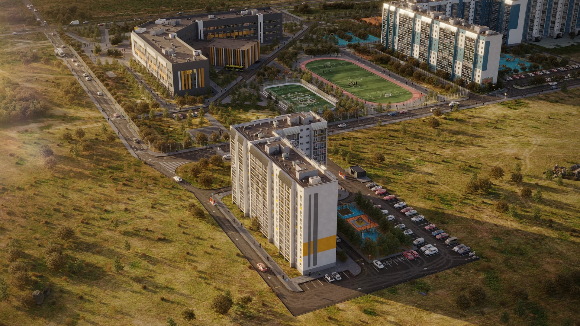 Уникальное расположение комплекса позволит реализовать идею нового городского пространства. Приватный и тихий район вдали от производств и оживленных транспортных артерий окружен новой инфраструктурой: школа, поликлиника, парк, бассейн, физкультурный комплекс. Новые широкие дороги позволят выстраивать удобные маршруты до любой точки в городе в объезд главных пробок.